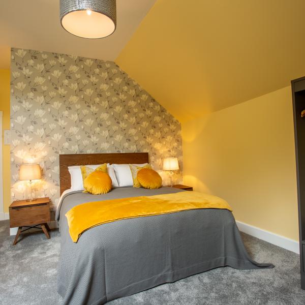 Generously proportioned Kings Size Room with ample wardrobe and drawer space, leather sofa, full length mirror, hair dryer, luggage rack, throws, black out blind.